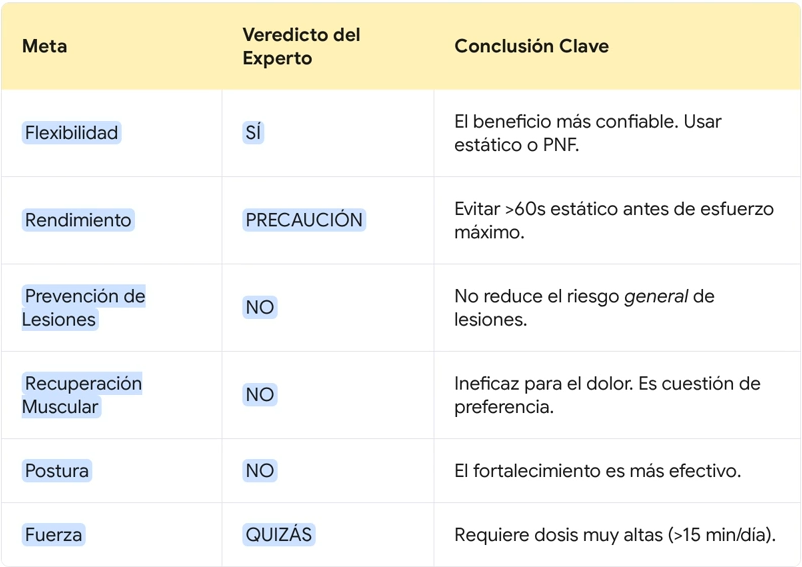 La ciencia ha hablado, y el mensaje es claro: el estiramiento no es la panacea. No es un remedio mágico para todo, sino una herramienta específica con aplicaciones claras y limitaciones bien definidas. Es excelente para mejorar el rango de movimiento, pero no te protegerá de todas las lesiones, no curará tus agujetas ni corregirá tu postura por sí solo.